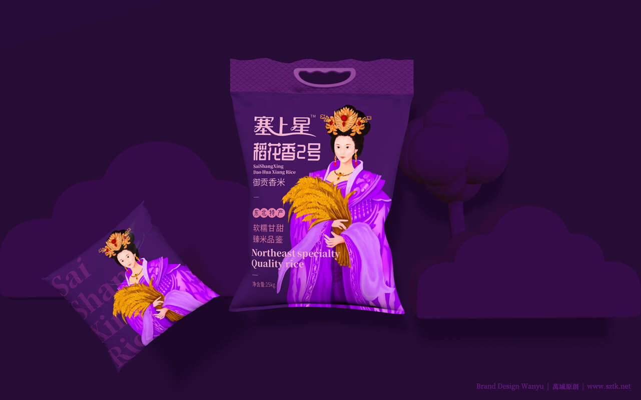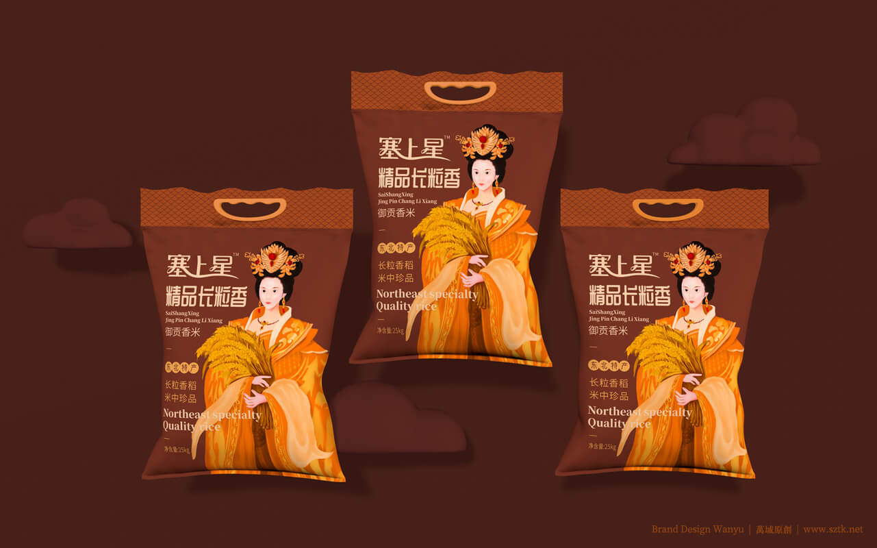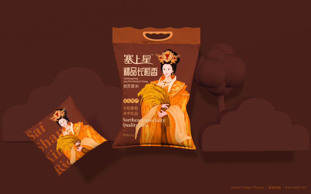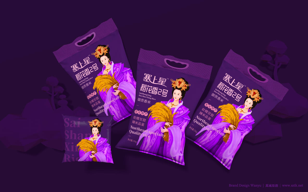 创意主题《皇家小姐》设计手绘出“面带笑容的美丽的皇家小姐姐”形象。带有皇家文化特点。美丽动人,拉近消费者距离。动作设置:面容娇美,手抱小簇稻穗。突出皇家小姐姐人物背景柔和。万域包装设计公司是一家创意米包装设计,大米包装设计,有机米包装设计,塞上星御贡香米包装设计公司,大米包装设计公司,有机米包装设计公司,农产品包装设计公司