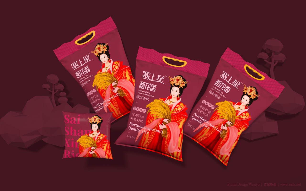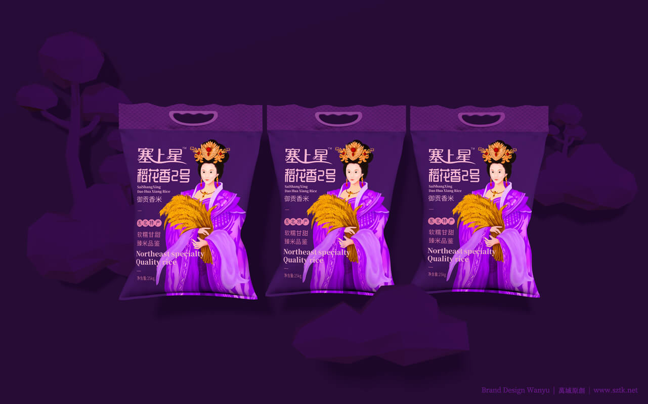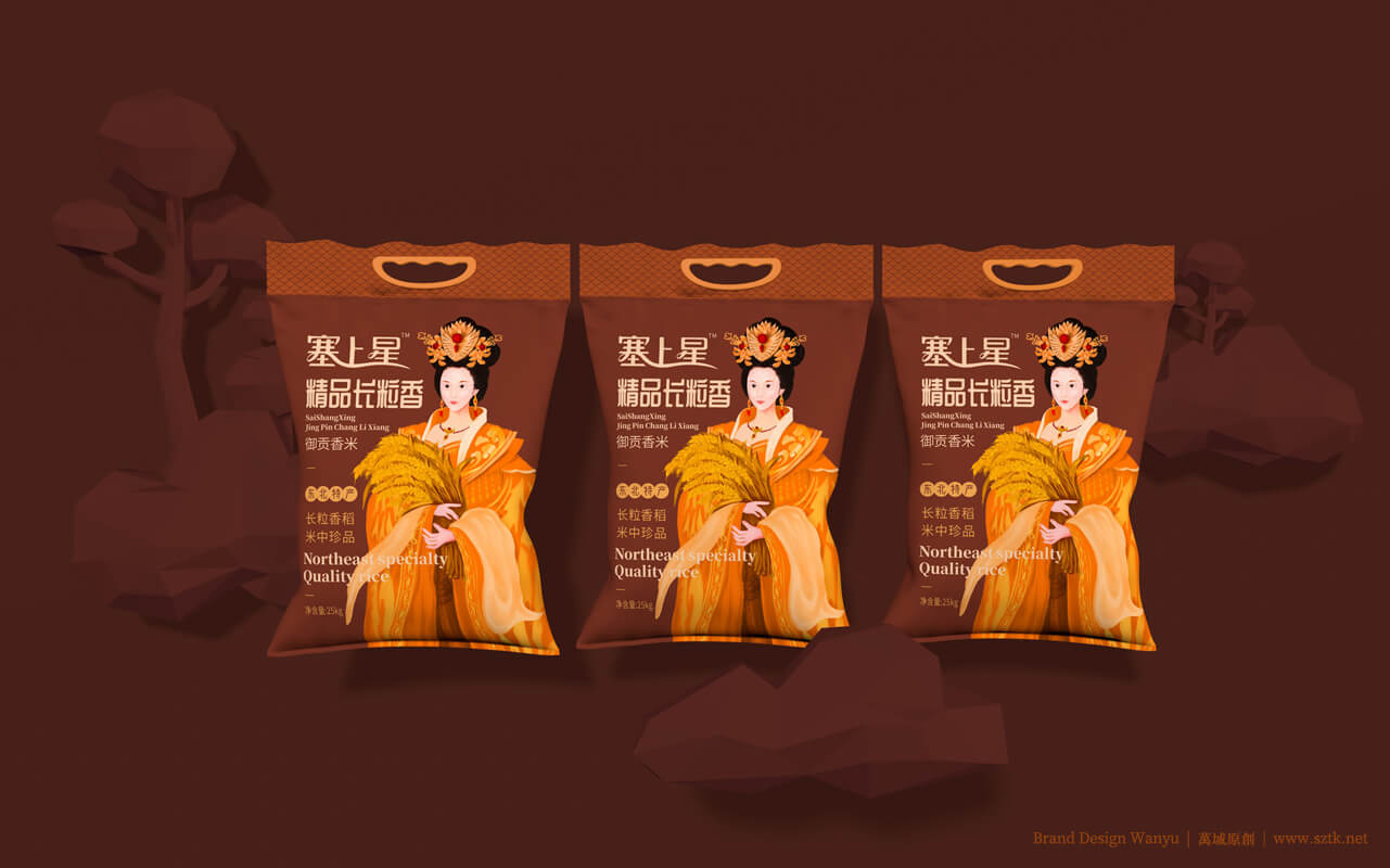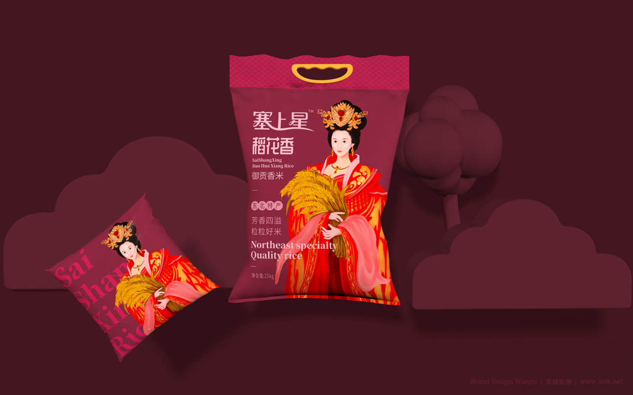 创意主题《皇家小姐》设计手绘出“面带笑容的美丽的皇家小姐姐”形象。带有皇家文化特点。美丽动人,拉近消费者距离。动作设置:面容娇美,手抱小簇稻穗。突出皇家小姐姐人物背景柔和。万域包装设计公司是一家创意米包装设计,大米包装设计,有机米包装设计,塞上星御贡香米包装设计公司,大米包装设计公司,有机米包装设计公司,农产品包装设计公司