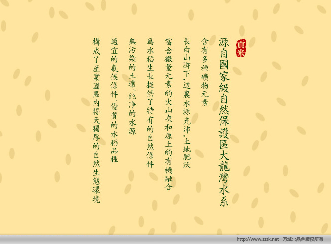 1、吉林知名有机米品牌; 2、高档品味感; 3、全系列产品行销形象